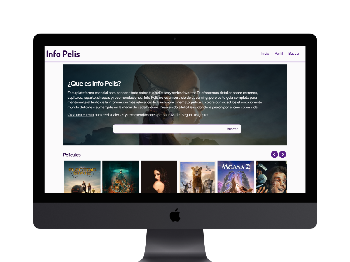 Cuenta con la funcionalidad de buscar películas o series por su nombre o filtrarlas por su categoría, mostrando su información y tráiler. Aplicación solo para escritorio